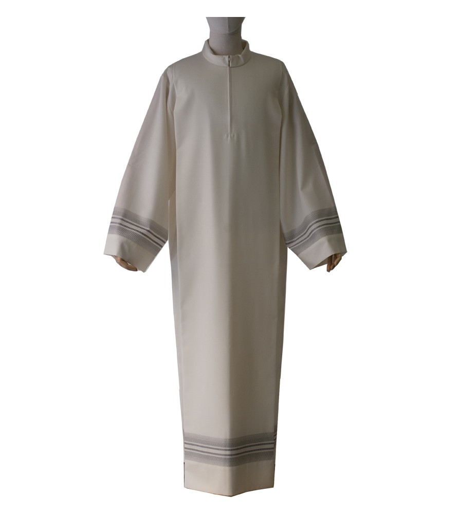 Alba con cenefa de color gris en mangas y bajo. Corte palas.