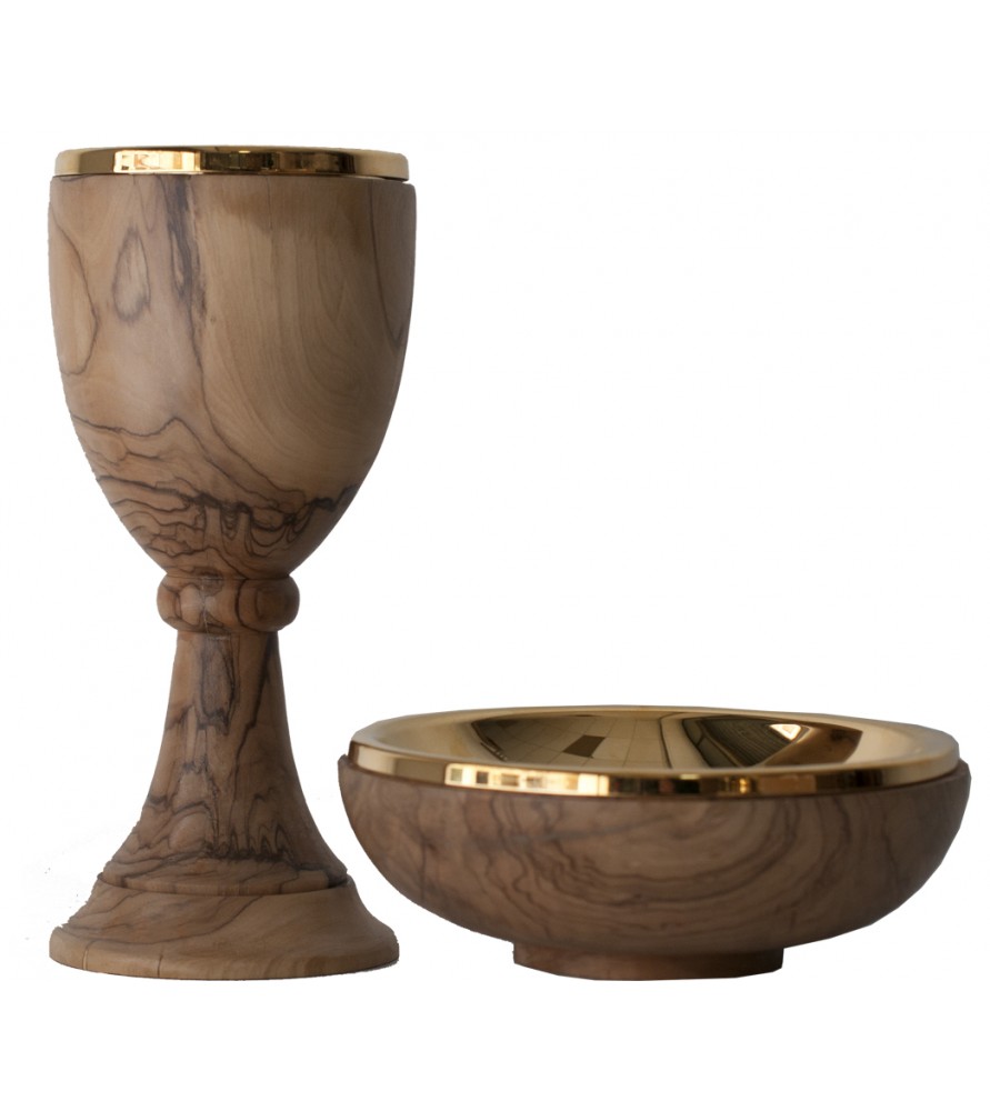 Juego de cáliz con copón patena realizado en madera de olivo.