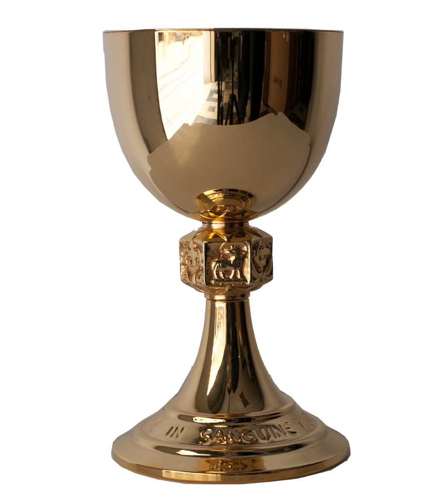 Cáliz realizado en metal dorado, el nudo está decorado con la representación de los cuatro evangelistas en bajo relieve.
