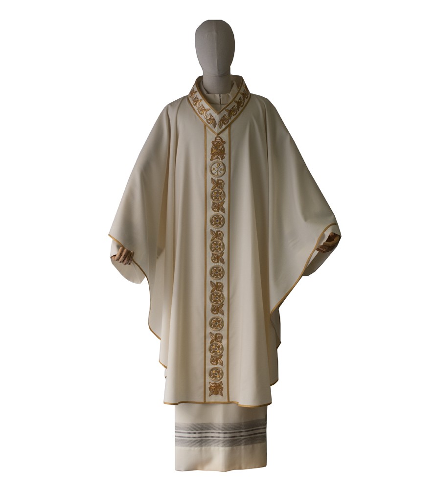Casulla confeccionada en pura lana con rico bordado en el escote en V y en el escapulario y adornados con piedras de Swarovski.