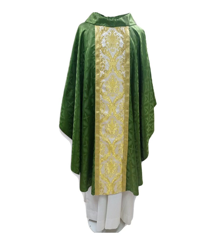 Casulla confeccionada con un tejido de damasco en color verde al que aplicamos un galón dorado.