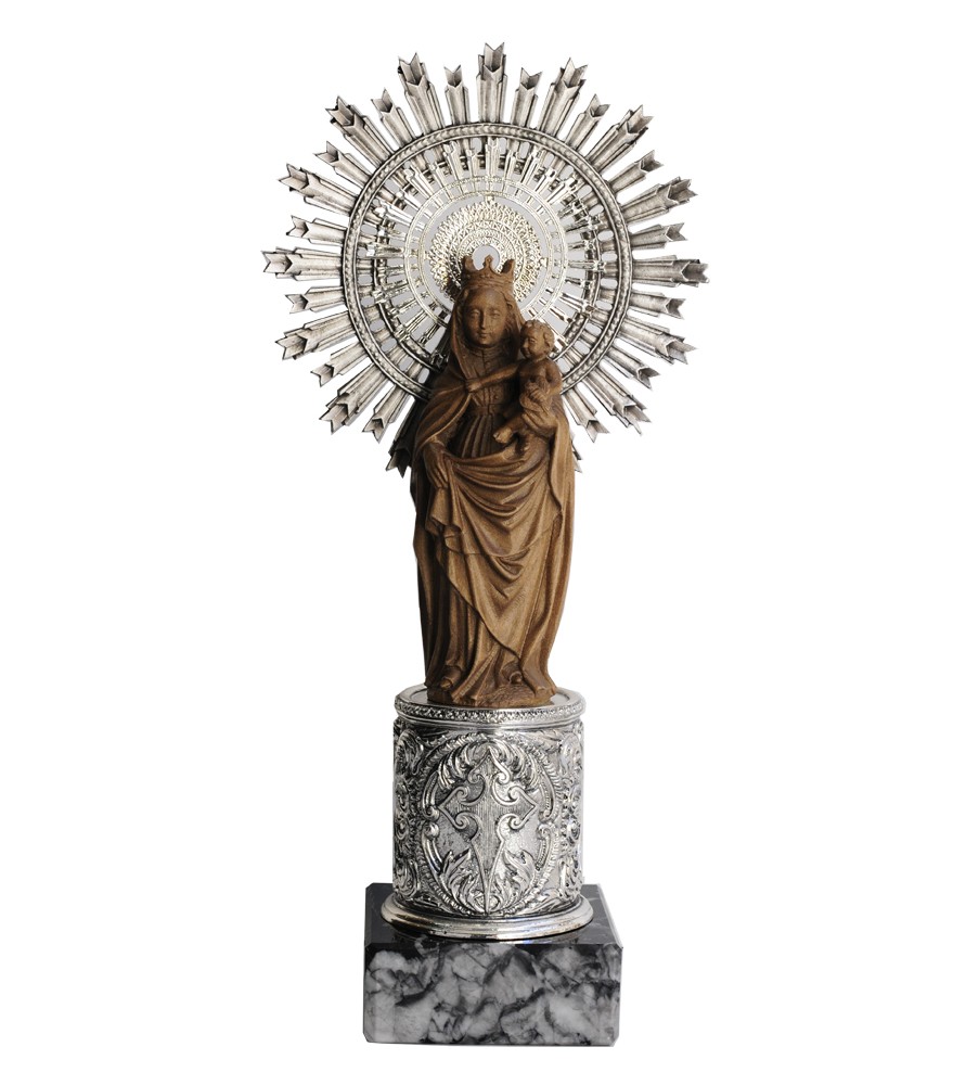 MATERIAL: Virgen de madera y columna y corona de metal baño de plata.