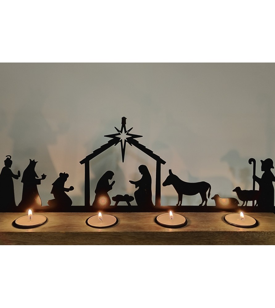 Belén decorativo con figuras metálicas recortas sobre una base candelabro de madera.